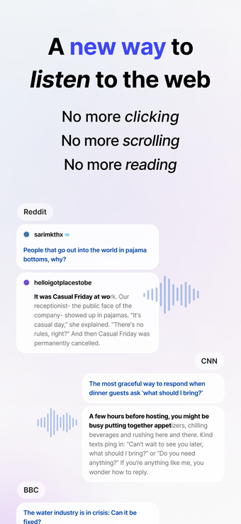 Little Birdie: Audio Browser เป็นเว็บเบราว์เซอร์ที่เน้นเสียงซึ่งเป็นนวัตกรรมใหม่สำหรับ iPhone ที่ช่วยให้ผู้ใช้สามารถเพลิดเพลินกับเว็บไซต์ที่ชื่นชอบในรูปแบบการฟังแบบไม่ต้องใช้มือ มันจะอ่านหัวข้อข่าวและบทความโดยอัตโนมัติ ทำให้เหมาะสำหรับการทำหลายอย่างในเวลาเดียวกันระหว่างกิจกรรมต่างๆ เช่น การขับรถหรือการทำอาหาร แอปนี้มีโหมด HEADLINE-ONLY สำหรับการอัปเดตอย่างรวดเร็วและโหมด HEADLINE & ARTICLE สำหรับประสบการณ์เสียงเต็มรูปแบบ ซึ่งให้ผู้ใช้เลือกความชอบในการฟังได้ตามต้องการ ด้วยการควบคุมสื่อในตัว ผู้ใช้สามารถข้ามบทความได้อย่างง่ายดายและมีประสบการณ์ที่ปรับแต่งได้